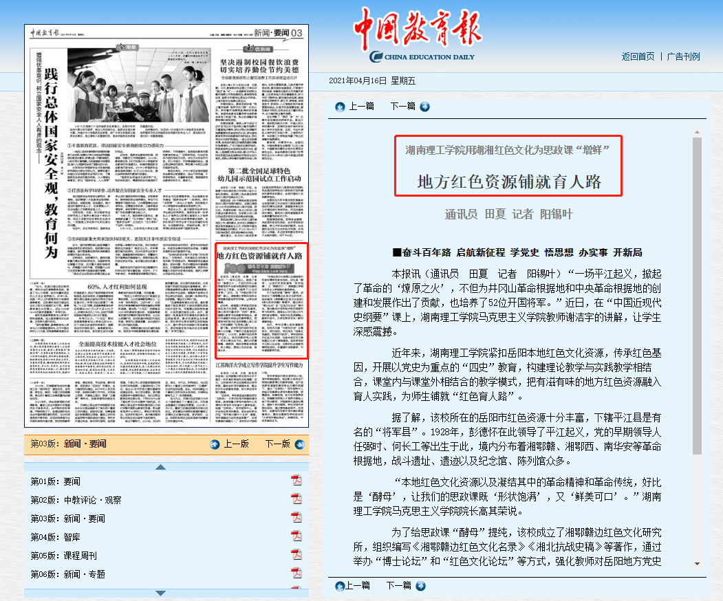 4月16日,《中国教育报》2021年04月16日第3版,刊发了题为《湖南理工学院用湖湘红色文化为思政课“增鲜”-地方红色资源铺就育人路》的报道。文章指出,学校依托校外红色文化资源,在革命老区平江等地建立50余个德育基地,组织学生到平江起义纪念馆、任弼时纪念馆参观等特色活动,丰富课外实践教学,升华课堂教学内容。