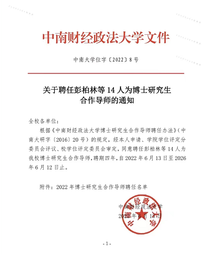 近日,中南财经政法大学公布了2022年博士研究生合作导师聘任名单,我院彭柏林教授被聘为该校伦理学专业博士研究生合作导师。