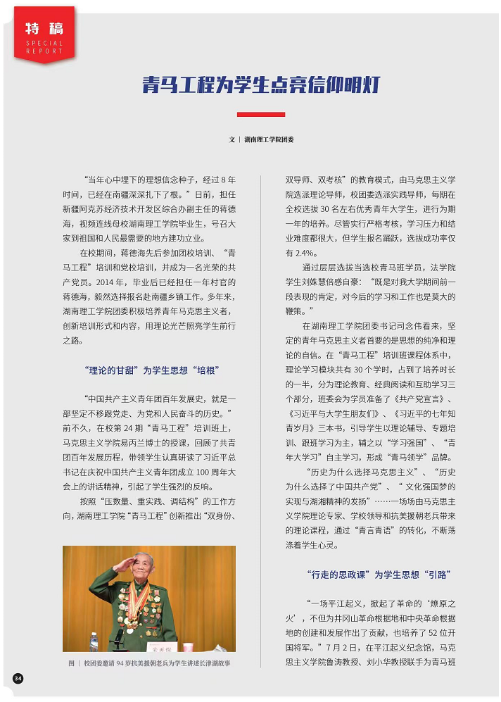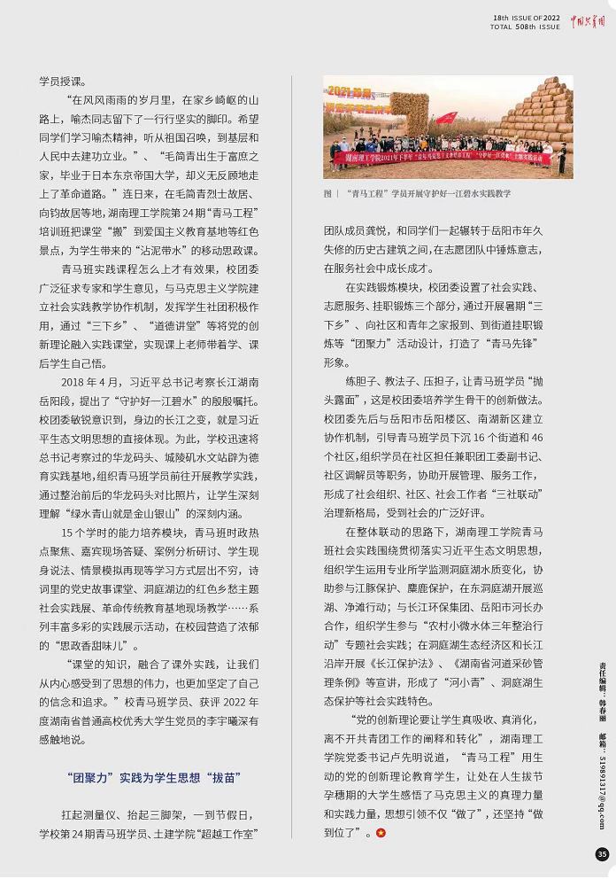2022年第18期《中国共青团》杂志以《青马工程为学生点亮信仰明灯》为题,以特稿形式推介我院参与“青马工程”培养工作情况。