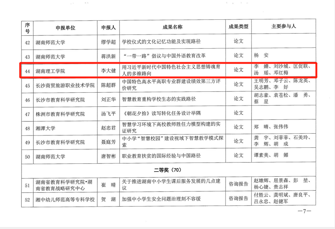 近日,湖南省教育厅发文公布第五届湖南省教育科学研究优秀成果奖获奖名单,我院李大健教授的论文《用习近平新时代中国特色社会主义思想铸魂育人的多维路向》荣获一等奖。