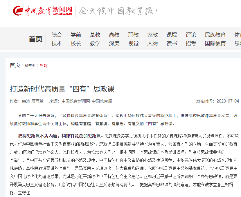 7月4日,《中国教育报》“大思政”(第09版)刊发我院院长鲁涛教授和青年博士易丙兰副教授联合署名文章《打造新时代高质量“四有”思政课》。该文结合习近平总书记关于思政课建设的重要论述、关于“大思政课”建设的重要指示,提出“必须抓好教师和学生两个关键主体,构建四有‘思政课’”:把握思政课本质内涵,构建有意蕴的思政课;拓宽思政课视域场域,构建有意境的思政课;创新思政课方式方法,构建有意思的思政课;完善思政课检验机制,构建有意义的思政课。