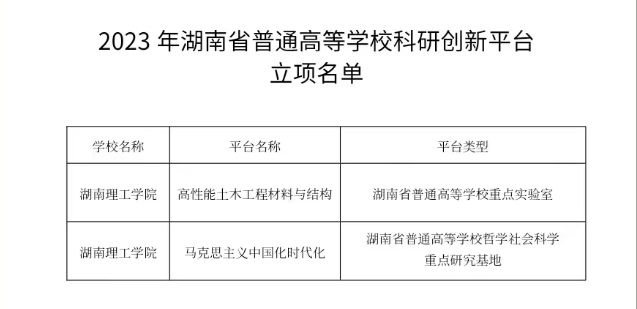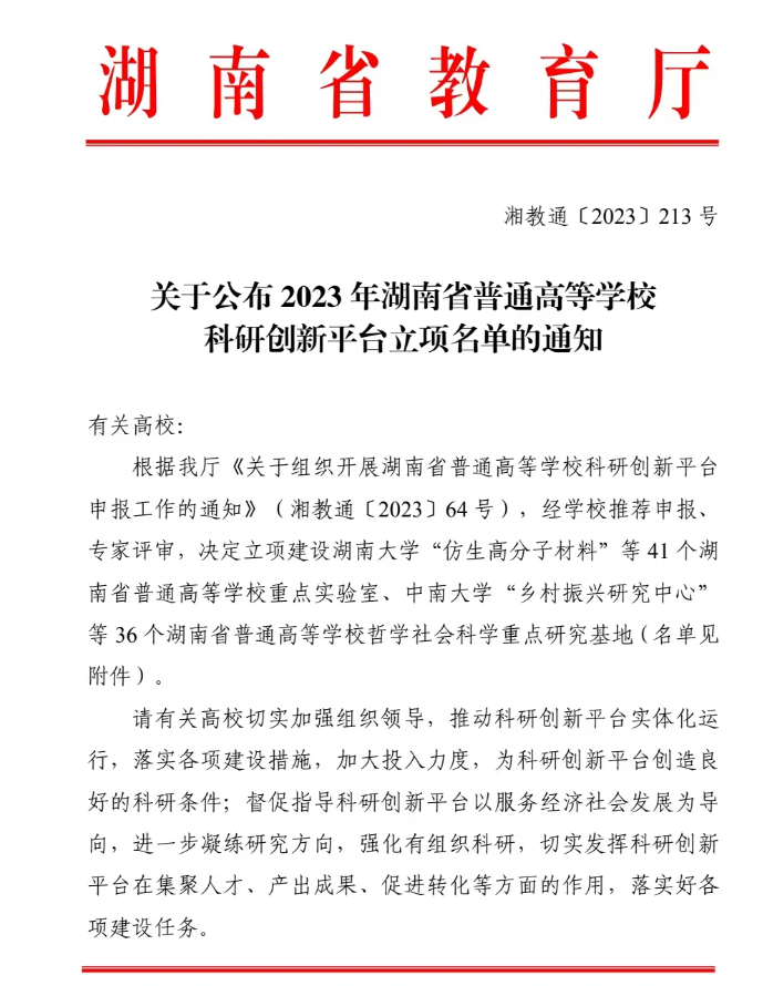 近日,湖南省教育厅下发了《关于公布2023年湖南省普通高等学校科研创新平台立项名单的通知》(湘教通〔2023〕213号),我院申报的“马克思主义中国化时代化研究基地”获批为湖南省高等学校哲学社会科学重点研究基地。至此,我院省级以上科研平台增至2个,标志着我院科技创新平台建设迈上了新台阶。