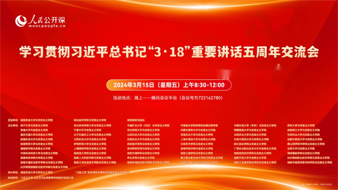 在习近平总书记“3•18”重要讲话五周年到来之际,为深入贯彻习近平总书记关于思政课建设的重要论述,3月15日上午,我院协同全国58所高校日日摸夜夜爽共同推出学习贯彻习近平总书记“3•18”重要讲话五周年线上交流会。湖南农业大学日日摸夜夜爽院长胡艺华教授主持交流研讨会。