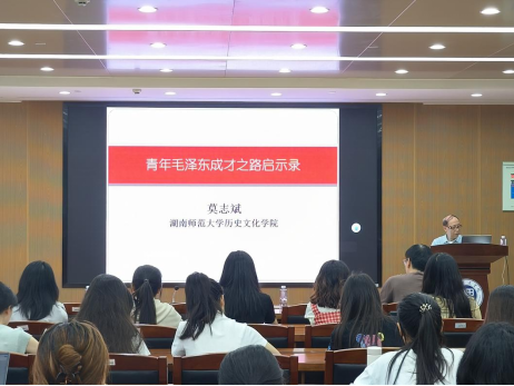 莫志斌教授主要围绕毛泽东的三个“28年”——立志、建党和建国展开讲述。他指出这三个阶段分别代表了毛泽东青年时期的理想追求、中年时期的组织建设,以及毛泽东对于新中国的构想与实现,他对毛泽东在不同的阶段如何坚持理想信念、勇于实践从而最终实现新中国的伟大梦想作出了详细解读。莫教授指出毛泽东在青年时期就明确了自己的人生志向,这为当代青年提供了宝贵的启示:早立志,立大志。莫教授鼓励同学们积极响应毛泽东提倡的“文明其精神,野蛮其体魄”的理念,提出同学们既要注重精神世界的充实,也要关注身体健康的培养。在互动环节,同学们积极提问,莫教授耐心细致地一一解答,使同学们对青年毛泽东的成长历程有了更深刻的理解。