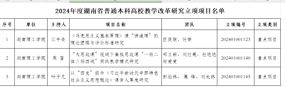 近日,湖南省教育厅发布《关于2024年度湖南省普通高等学校教学改革研究项目立项的通知》,我院江午奇、周蓓、叶子凡三位青年博士获批重点项目,创学院历史最好成绩。