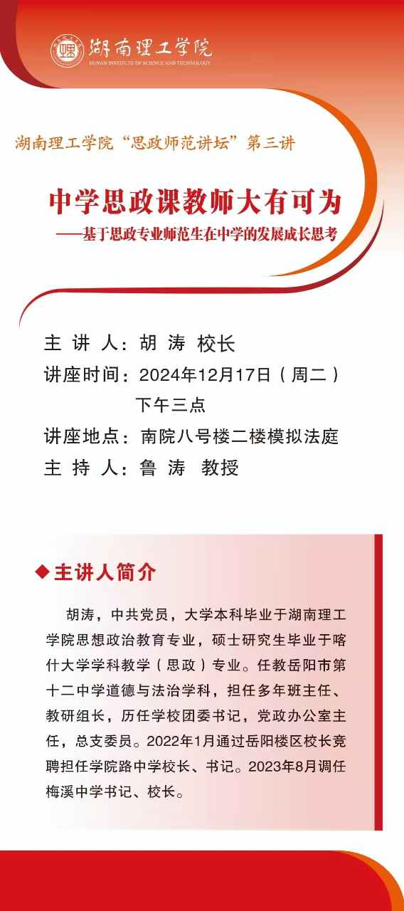 湖南理工学院“思政师范讲坛”第三讲预告:中学思政课教师大有可为