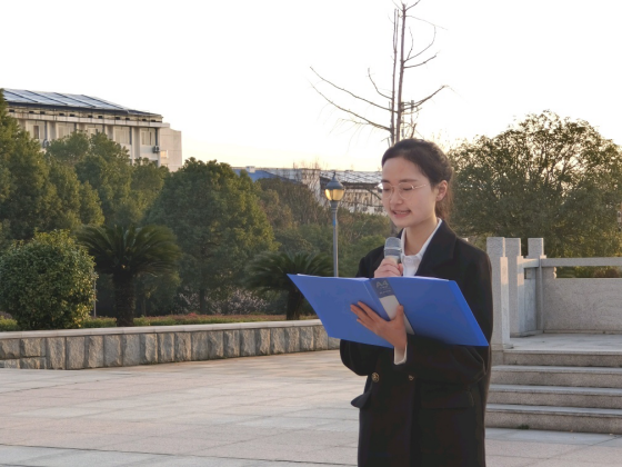 20级思想政治教育专业学生包心怡作为学生代表在国旗下作“心有所信,逐梦新时代”的主题发言。她号召同学们应该不惧挑战,勇敢追梦,用自己的行动去真正书写和践行“强国有我”。